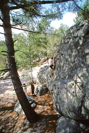 This is the scary highball city of Fontainebleau. Fear not however because there are a lot of easier problems with lovely flat sandy landings. The rock is generally soft here, and you tend to get problems on good holds, but sloping and with worn footholds. Because the area is one big sandpit, it is very popular with families and those with toddlers. At the weekend it is very popular with picnic-ers, and general petanque enthusiasts.