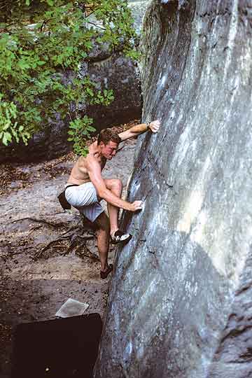 FRANCHARD - CUISINIERE This is the big area for hard climbing in the Font 6b and upwards. It is situated under grand pine trees and always looks green. The trees are bizarre, becaue they also keep the area very dry, and the green lichen is not actually on the holds or the important parts of the rock. We include 2 circuits from this area. It is quiet and mystic. FRANCHARD ISATIS This is the best shady outcrop in the forest, and everyone knows it - so on a hot Sunday it will be packed out, also on hot evenings when everyone finishes work. The trees that shade this area are birch, so you do get a lot of drip-drip. Many classic hard problems as well as many easy ones. Is polished in parts but doesn't seem to detract. FRANCHARD HAUTES PLAINES There are two other areas to visit, this and Sablons, and are much better suited to low grade bouldering. You should not miss these superb areas, both are covered in our book. |