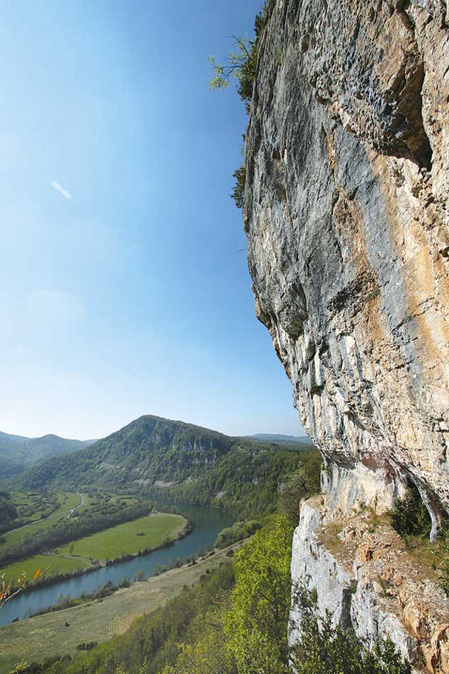 There are no particularly famous cliffs in the Jura, but there is some really good climbing to be found. The most popular venue to stay is the Ornans valley on the river Loue. There are no shortage of excellent cliffs such as Roche Barmaud, Breme, with the high grade attractions of Saint Germain, Baume et Syrtau and Rurey. The rock around Saint Claude is less than perfect, so we have been careful with cliff selection here, but Mont Robert and Crenans near Moirans-en-Montagne are a defintie must visit. The river Ain flows from this area, lots of lovely lakes, and make sure not to miss Jarbonnet - an engaging place, both with views and for the climbing.