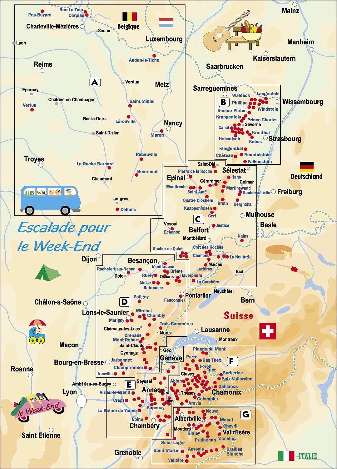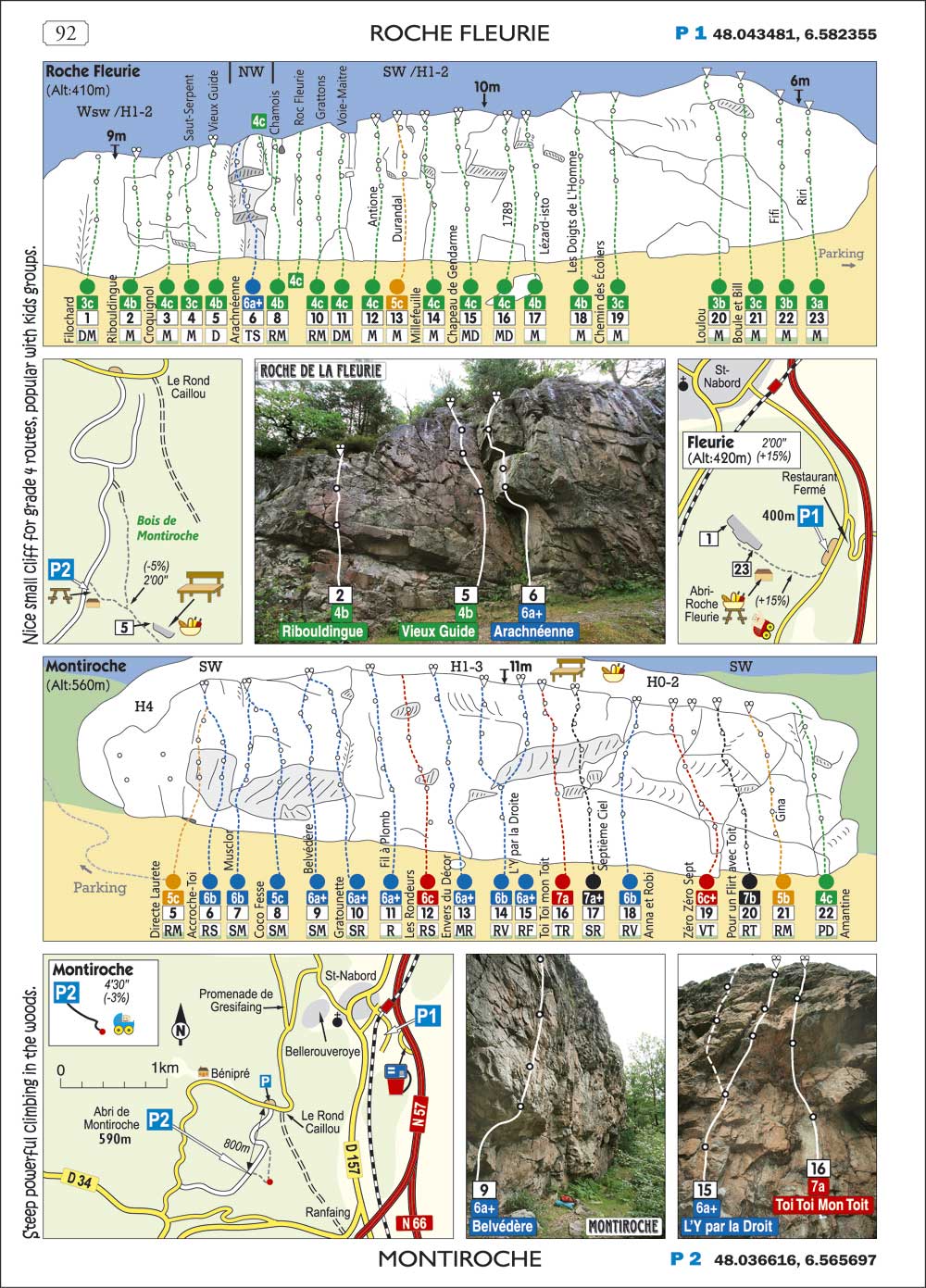 FRANCE ROC 2 - EST-East ESCALADE pour le WEEK-END This is the SECOND rock climbing book in our series FRANCE ROC, and it includes a massive 256 cliffs spread across 17 departments in the East of France. The concept of the FRANCE ROC series, is give climbers a practical and portable/compact guidebook, that makes a fantastic selection of cliffs which appeal to the majority of climbers. It is designed for everyone looking for somewhere else to climb at the Week-End, other than their local area. If you want to have FUN at the Week-End, this is the book to get you going. 250 CLIFFS There are literally thousands of cliffs in East France, however, many are completely inaccessable, others have very poor rock quality, and lots are so devoid of holds there is nothing below 8a going to be possible. There are around 500 excellent quality cliffs in this region that have been equipped with bolts, and I have selected to what I consider are the best 250, that will appeal to climbers looking for; nice location, good range of routes in all levels, FUN picnic possibilities, and nearby pleasant campsites. 7 AREAS The book is sub-divided in to 7 large areas that are practical for climbers - see map below. These areas do not follow any political or departmental boundaries, they are simply where there are cliffs near to each other.They naturally form areas that climbers would visit for a week-end, and offer a good selection of cliffs to choose with different temperatures and weather conditions during the year. Each area in the book has an excellent overview map, with a full data page opposite that gives all the important information to easily select the cliff for the day. Information such as number of routes in each grade, drying times, amount of shade, style of climbing, proximity to campsites, supermarkets and occoasionally key petrol stations. Opening times of campsites are given - but be sure to check with the campsites own website - especially if close to the opening-closing dates. DESIGN LAYOUT The design of the book is compact, and tries to illustrate the majority of cliffs on a single page. Each cliff has an excellent map for finding the car park - along with decimal GPS co-ordinates. Most cliffs will have a secondary map to get you from the parking to the cliff. Photos are then used so that you can be sure to identify the key features of the cliff, and link up with the graphics so that you can be 100% sure of the route recognition. All routes on the topos are given their historic sport grades, but are also coloured in the classic Fontainebleau colour system that uniquely covers grades. Very big cliffs are only partially included since it is expected that most climbers will enjoy buying the local guidebook if it is available. (Sample of 2 cliff page below map)