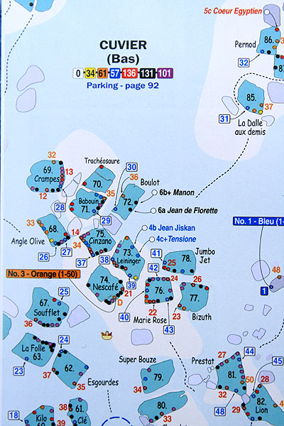 TRAVEL TO FONT: Car is the best recommendation. 900 square km, so that says it all, and 780 empty sq km with no boulders. The areas in Fun Bloc are very highly concentrated, so once you get to them, sure you don't need a car all day. Cars do get broken into at the quiet forest parking areas, so most climbers leave them open and completely empty. If you don't have a car, then fly to Charles de Gaulle airport in the North of Paris, rent a car for your duration at Font. Paris traffic is a nightmare, so leave plenty of time. There are 3 ring roads, Pereferique in the centre - really bad, A 86 a mid connetion - not so bad but not good, and the N104 very outer ring road - this is best but gets very snarled up as it crosses the A4, and also has some big shopping centres on it - so not ideal either. Arbonne le Foret in the centre of the forest always has speed traps and alcohol testing, so best not to take any chances and keep the mad attitude to the climbing. If a car is not possible, then the only sensible option is to stay at Musardiere Campsite, where you can walk to the climbing in the Trois Pignons. Only way there is by taxi from Font Avon Station.