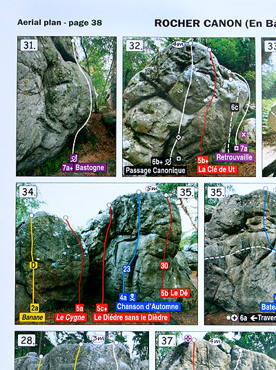 GEOLOGY: The rock is sandstone and varies in consistency. In some parts it hardly holds together, so is not ideal for bouldering. Fortunately in most parts, it is very strongly bonded and is ideal for bouldering - giving enough friction - but not too much. The type of sandstone found in Font is rare, because it comes from a limestone sandwich, unlike the majority of sandstone found elsewhere around the world. In general terms, the sandstone was formed over a flat sea of limestone, to form a relaitvely thin crust. Then another layer of limestone was formed on top, compressing the sandstone. The genius part thereafter was a slight bending of the earth, so the sandstone shattered like cobbles between the two limestone layers. With water and other elements flowing through, a lot of the cobbles formed layers of quartz on their outer sides. Eventually the top layer of limestone wore away and the result was thousands - if not millions, of blocks were left, covered in highly protective quartz. All of the softer sandstone blocks have been eroded away, and it is the more dense ones that are left. So essentially climbing at Font is bouldering on blocks of sandstone with tiny flakes of quartz. On the hardness scale where steel is 4 and diamond is 10, .Quartz comes in at 7, so when the rock polishes from the tiny grains of quartz-sand deposited from the soles of your climbing shoes and ground in, there is nothing on earth - apart from sapphire and diamond that will unpolish the holds. Tree resin used locally (pof), to make climbing more pleasureable is biodegradeable and has a hardness of 1, so anyone telling you that the holds are polished by resin - is taking you for a complete pratt - idiot - numpty - call them what you want to. Major outcrops like Cuvier and Cuisiniere have highly dense sandstone. Gros Sablons in the book Top Secret, is very high in quartz and feels like skating on glass which can be incredibly disconcerting, especially as the boulders are very high too. The most dense rock is generally found in a middle band running through the whole area, with outcrops in the south like Elephant, and Padole in the North - having much softer rock. However there are superb exceptions such as Troglodyte (Top Secret) and Beauvais (Fun Bloc) that have dense rock too. So in general, always use a crash pad, and take a small piece of carpet to stand on before you start a problem, so you leave the ground with perfectly clean shoes and therefore do not add any extra polish to the footholds. (Clean your shoes before you step onto the carpet). Also this is useful since quite often the start of the problem - is not actually the centre of the fall zone, and if you are intelligent - you will place your crash pad at the centre of the likely fall zone. Chalk (Mag carbonate) versus Pof (resin), both are great - enjoy. Just clean off anything visible after and make tick marks as tiny as possible, top tip - climb very precisely at Font - it works.