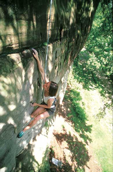 SANDSTONE - SOUTH EAST ENGLAND ERIDGE GREEN ROCKS 2 miles S-W of Tunbridge Wells A very quiet twisting outcrop in dense trees for most part. The rock here is pretty soft, so pull lightly and lardies keep away. Conservation is an issue here, so please be considerate when climbing and look after the environment please. Around 80-100 routes, not very many easy ones, and a few really hard classics. The rocks are very broken and vary between dank and forboding bays, to fine little prows that seem deviod of good holds. Most routes have a crux that tends to be a thumping stopper of a move, so it is quite handy to have a bit of strength up your sleeve. Very nice footpath beneath the rocks that face East in the main. They remain sheltered from the wind, and can stay a bit damp - so when the midges get going in summer - they love it. Photo: Genesis 5c, Eridge Green. Climber: Virginie Beriner |