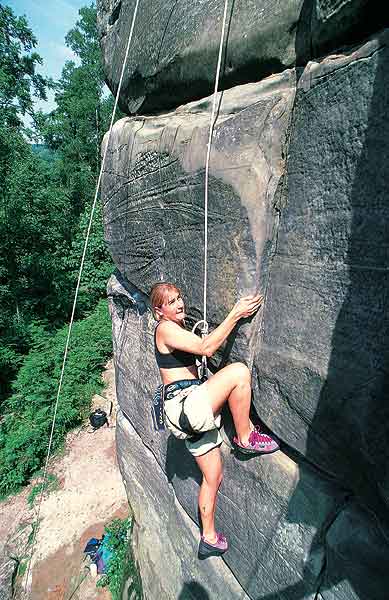 SANDSTONE - SOUTH EAST ENGLAND HARRISONS ROCKS GROOMBRIDGE, near Tunbridge Wells: 350 routes in all grades A wonderful Sandstone outcrop with a huge selection of short and technical routes. The cliff forms two parts, with a third of the routes facing South, and the rest to the West. Trees give an assortment of shade, allowing some routes to dry out in quicker than others. SUNDAY AMUSEMENT Our guidebook will put you in good stead to understand the layout of the routes along the edge. We give little parachutes to illustrate where to find the easy ways up and set up a top rope. You will often find many locals here at weekends - who know all the climbs like clockwork. Don't be put off, since they have been doing them for years and have them very well practised. You will be well advised to watch them climb very carefully, since most of the routes have little tricks to them. It is a nice spot for a picnic, and the whole area turns into a fun jamboree sometimes. VARIATIONS Our guidebook gives every route here, plus a lot of variations to many. Because of top roping, just about every inch of the rock is climbed - or has been climbed. There are countless other variations that we did not have room to put into the book. BOULDERING There is a very small bit of bouldering here, but since the rock is soft, it has tended to wear very badly, and you are reccomended to visit an indoor wall if you really want to start cranking hard. Photo: Niblick 5b+, Climber: Joanna Smyth |