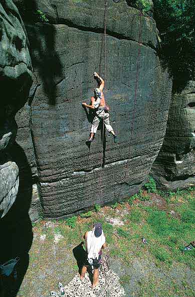 SANDSTONE - SOUTH EAST ENGLAND HIGH ROCKS 1 mile West of Tunbridge Wells This is the tough draw, hard climbing outcrop of the area, with some testing routes up to UK - 7a, and maybe harder. The rock formation here is very special indeed, with deep passage ways, small canyons, and flared off width cracks - smeared in green slime! There is just about something to test anyone here - no matter how good or experienced they are. SUB GRADES We give suffix's to 6a, 6a+ etc. in our guidebook, which should prove useful to a lot of visiting climbers, and enable them to pick out more amenable routes. There are not very many easy routes here - and not that many medium routes either. You need to be cranking 5c to get a lot out of this outcrop. WEDDINGS TOO The outcrop is owned by a small wedding pub opposite - whose owner Guiseppie, gets on pretty well with the local climbers, and has allowed them to clear a lot of undergrowth and therefore keep routes open and dry. The rocks stand nicely proud and give a charming outlook. PRIVATE LAND The pub charges and entry fee to the rocks that climbers must pay too. At present it is £5 for the day. Please use the toilets at the pub since the area is more of a garden than a wilderness. Photo: Nemesis 6b, High Rocks. |
