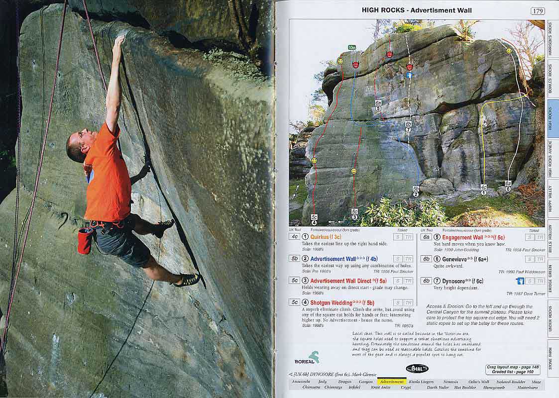 SANDSTONE - SOUTH EAST ENGLAND This book includes all the worthwhile rock climbing in the South East of England. There are 9 important areas included in the book, that have groups of rocks which form small outcrops and give fine climbing. The Weald is an undulating area of Sandstone that is sandwiched between the North and South Chalk downs. At Hastings on the coast, the rock is soft - too soft. Between Tunbridge Wells and East Grinstead, the Sandstone is exposed on the surface and has weathered to form a hard crust that supports a small amount of weight. Even here, one has to be thoughtful and careful with protecting the rock - and climbing whilst the rock is wet (and consequently weak), is not allowed. IDYLLIC COUNTRYSIDE The rock has been weathered naturally by the wind and rain, forming superb looking buttresses and pinnacles. They are tiny compared to the giant towers of Saxony, but still give a magical feel - intermixed with fine oak and beech trees, plus the lovely bluebell woods in spring. FRIENDLY ATMOSPHERE Because of the rock is so soft, natural climbing gear protection has been banned. If the skin of the rock wears away, then the substructure collapses instantly. Bolts have been placed at the top of the cliffs for top roping. Because of this, you often get climbers grouping together and hence a chatty convivial atmosphere develops. TRICKY ROUTES The rock is very rounded, and gives sloping holds - quite different to that of an indoor climbing wall. There are not so many holds either, and the friction in general is poor - compared to Northern Gritstone. This makes life quite difficult for the beginner. However, once the apprentiship is completed and the local techniques learnt, you will be able to unlock even the trickiest of routes. LONG SEASON The weather does play an important part here. If the rock is wet, then it is soft and will break - so please do not climb in these conditions. The rock remains in good condition from mid March through till the end of October. You can sneak good winter days, but green algae does grow, and only some parts dry out fully. GETTING A GUIDEBOOK Either buy one from your local climbing shop or on the web, or visit the local climbing wall called Evolution - at Lye Green, just SW of Groombridge. Pubs of The Junction in Groombridge and High Rocks also sell copies. COLOUR TOPOS All of the photo topos are in full colour and include the latest in clean grahic design techniquies. The grades are clear and easy to use, plus routes are colour coded in the same advancing colours as skiing & Fontainebleau. JINGO WOBBLY BOOKS - COPYRIGHT: All the photographs in our books are copyrighted, along with all the text and photo-topos. |